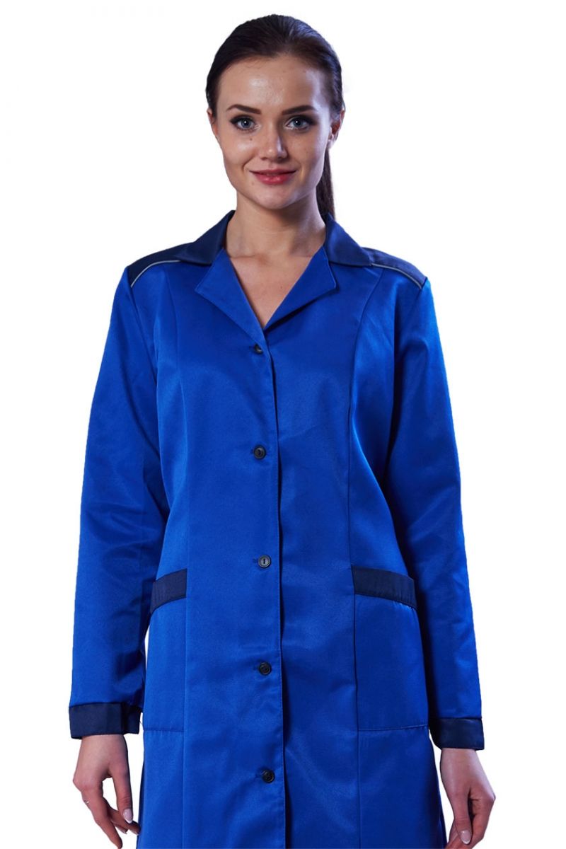 Халат с центральной бортовой застежкой на петли и пуговицы, со смещенным плечевым швом, воротник отложной. Полочки с вертикальными рельефами, с двумя нижними накладными карманами с наклонным входом. Боковые срезы карманов входят в боковые и рельефные швы.
